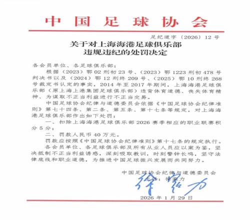 北京時(shí)間1月29日,中國足協(xié)通報有關(guān)涉案俱樂(lè )部及人員行業(yè)處罰情況,9家中超俱樂(lè )部被不同程度地扣除新賽季聯(lián)賽積分。分別被扣10分和5分的上海申花和上海海港先后發(fā)聲,表示接受處罰決定。