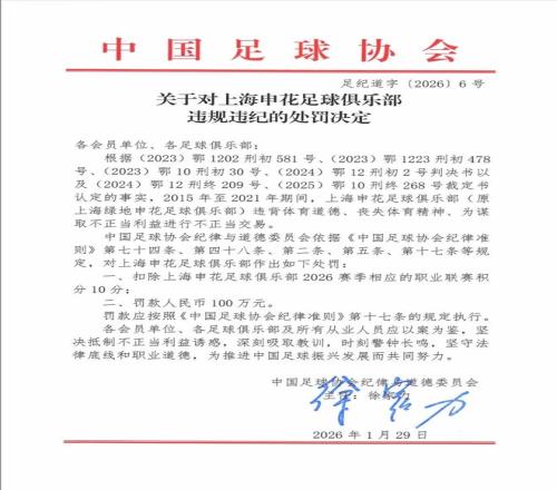 今天中午,中國足協(xié)官網(wǎng)發(fā)布《中國足球協(xié)會(huì )關(guān)于對有關(guān)涉案俱樂(lè )部及人員行業(yè)處罰情況的通報》,公布對涉案俱樂(lè )部的處罰決定。罰單明確,上海申花在2015年至2021年期間,違背體育道德、喪失體育精神、為謀取不當利益進(jìn)行不當交易。因此足協(xié)依據紀律準則相關(guān)規定,對申花處以扣除2026賽季聯(lián)賽積分10分、罰款100萬(wàn)的處罰。