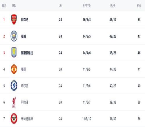 在積分榜上,阿森納依然高居榜首,拿到53分。阿森納的兩大爭冠勁敵曼城和維拉都丟分了。曼城總積分是47分,落后6分,排名第2。而阿斯頓維拉依然是46分,排名第3。曼聯(lián)殺入歐冠區,總積分41分,排名第4。切爾西以40分排名第5。利物浦只拿到39分,掉到了第6的位置。