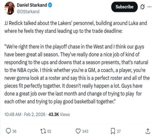 并且就目前的情況來(lái)看,湖人隊大概率不會(huì )在截止日前有大手筆的操作,雷迪克賽后被問(wèn)到相關(guān)問(wèn)題時(shí)也給出類(lèi)似答案。